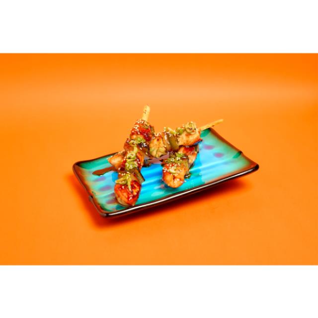 Brocheta de pollo a la plancha con salsa agridulce, cebolla, pimiento, cebollín y ajonjolí