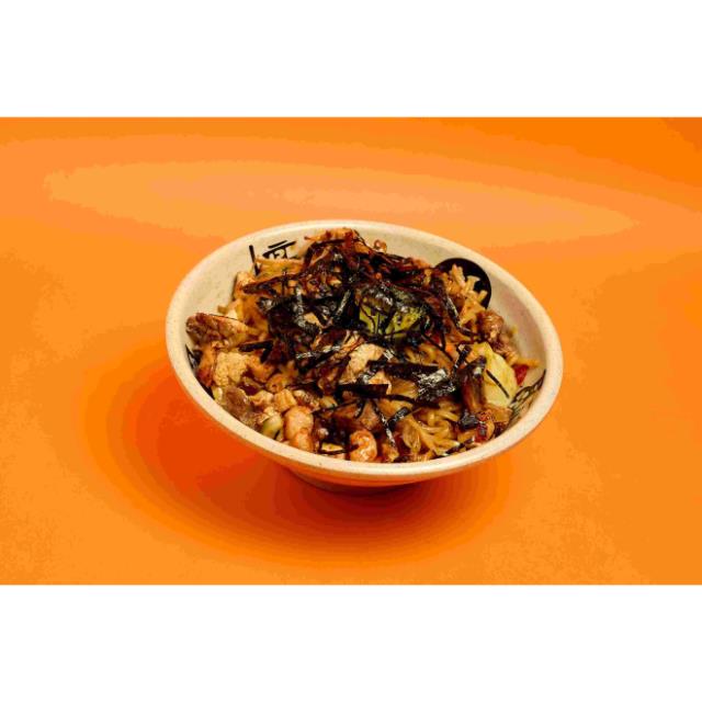 Arroz frito con verduras, pollo, carne y camarón. Sazonado con ajo, germen de soya y champiñones.