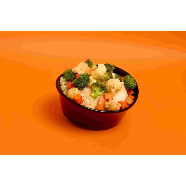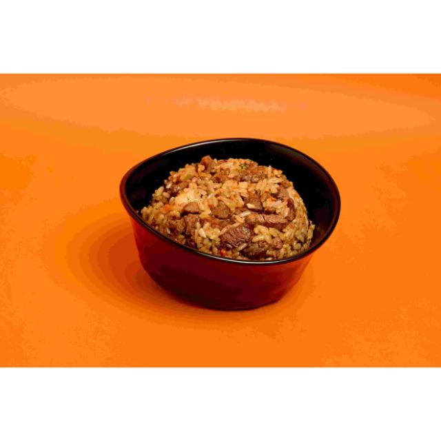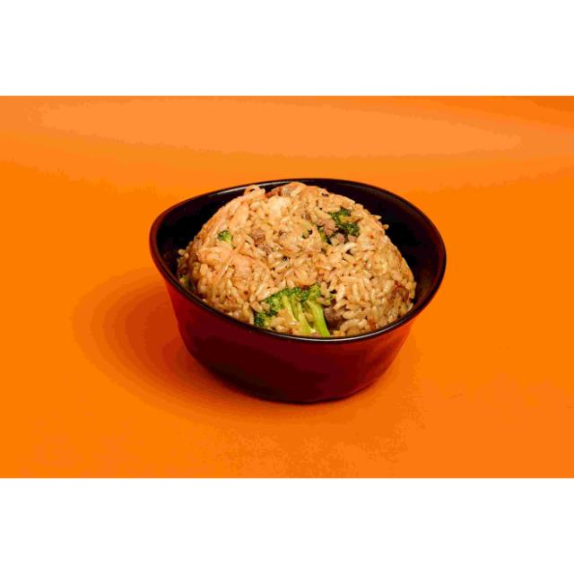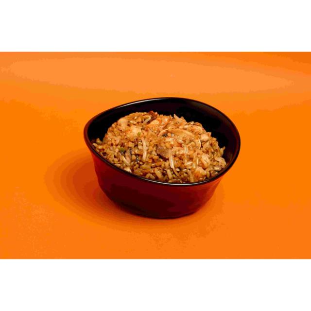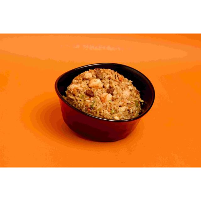 Arroz frito con verduras, pollo, carne y camarón. Sazonado con ajo, germen de soya y champiñones.