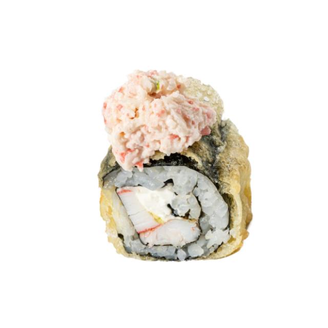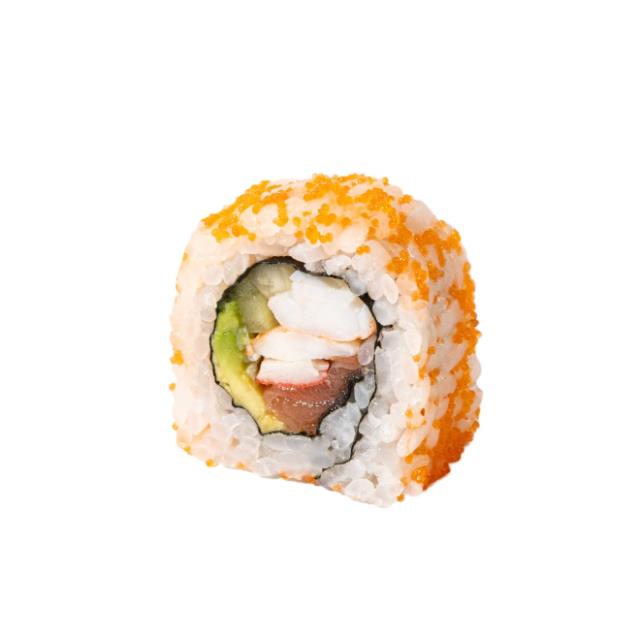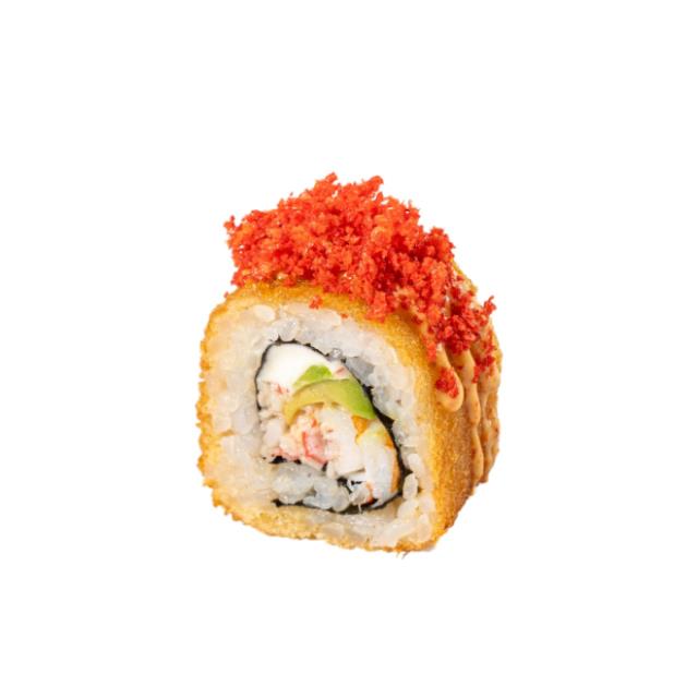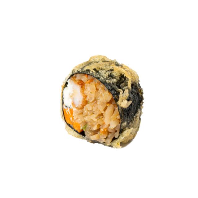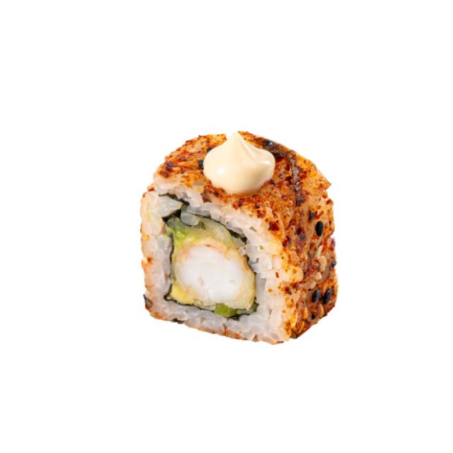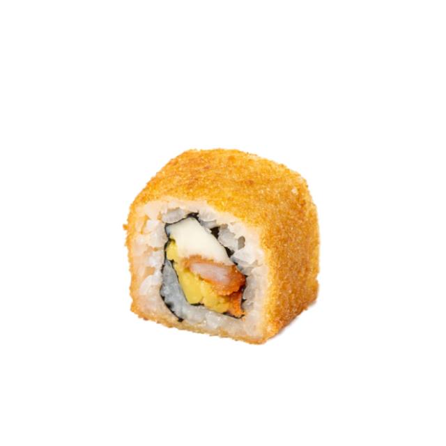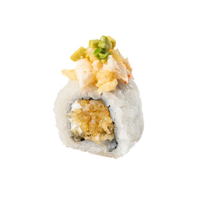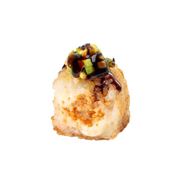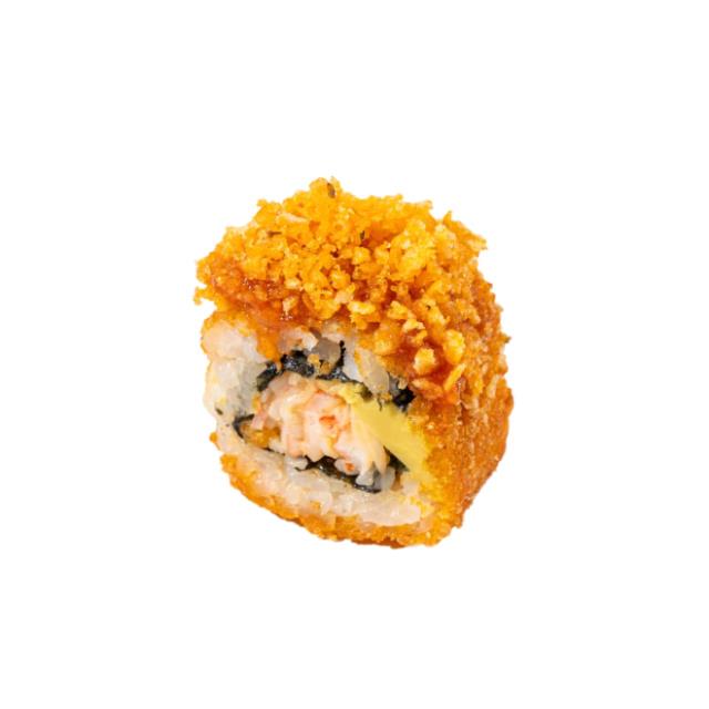 Camarón empanizado, queso manchego, aguacate Y masago.