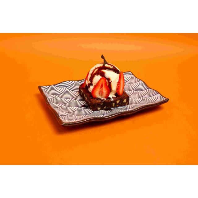 Brownie de chocolate caliente y nuez, con nieve de vainilla y chocolate liquido.