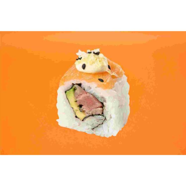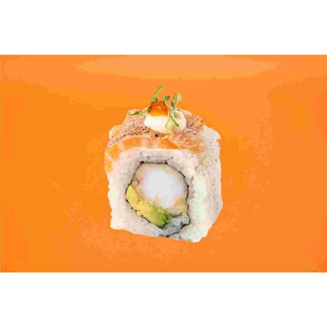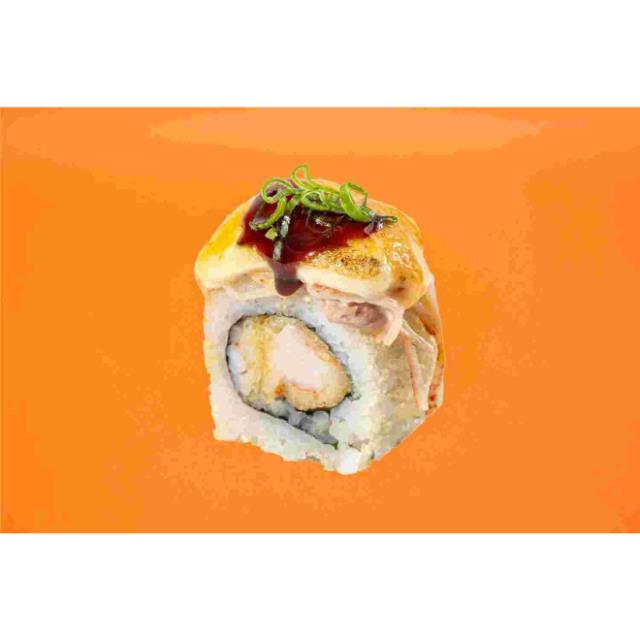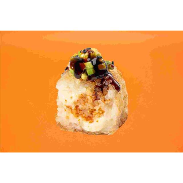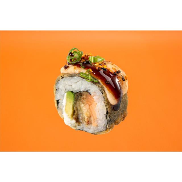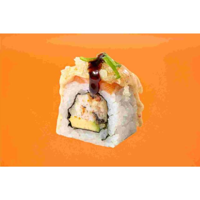 Salmón, anguila tempura, aguacate, queso crema ( ) Salsa fujiyama, salsa de anguila, furikake mirai, cebollín