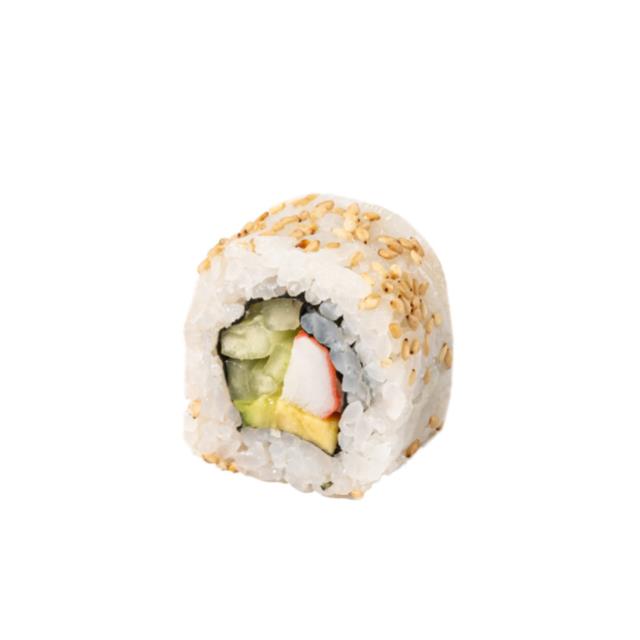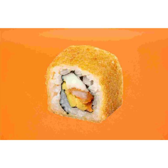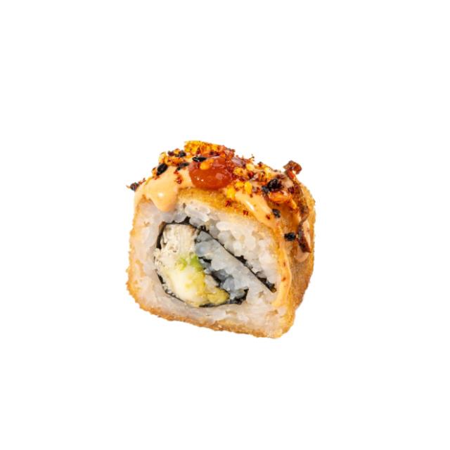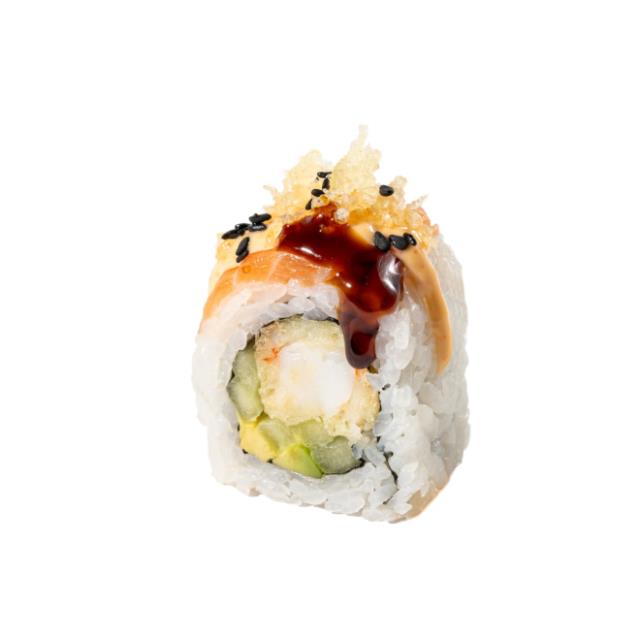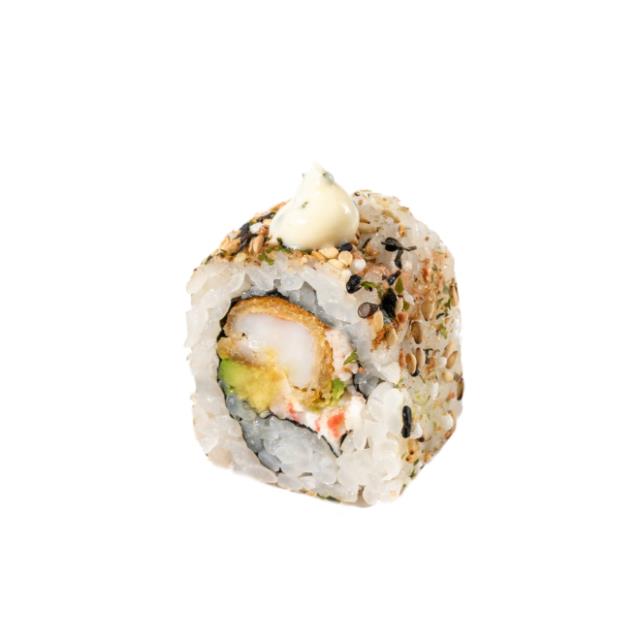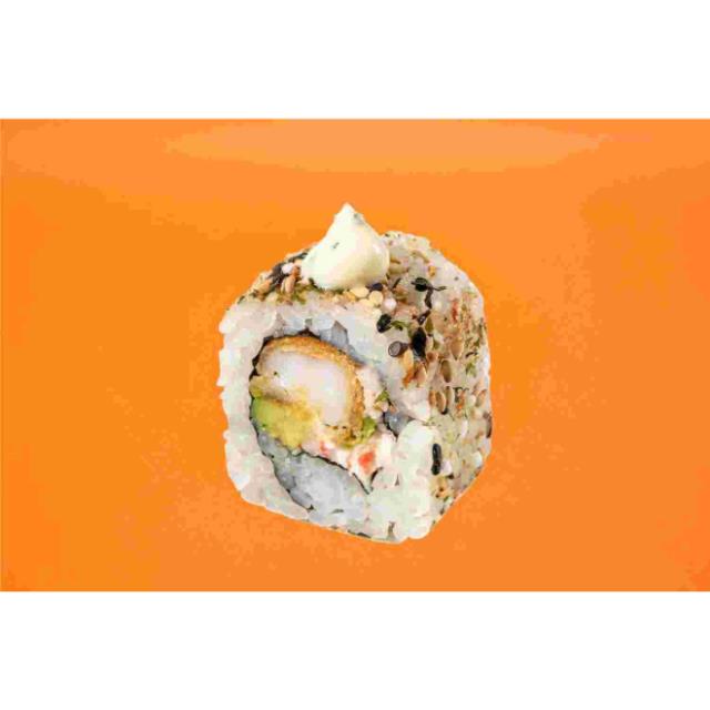 Camarón empanizado, anguila, surimi, pepino y queso crema. - guacate, salsa de anguila y ajonjolí.
