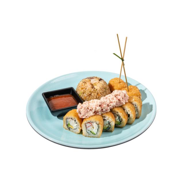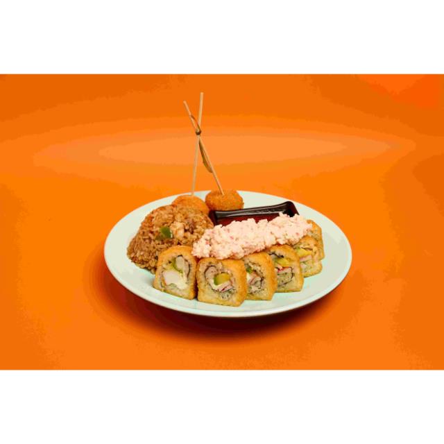 1 Rollo a eleccion, 2 kushiages de queso manchego, Flaming hot o Ruffles, 1/2 Arroz Mixto,Sunomono de Cangrejo, O Yakisoba