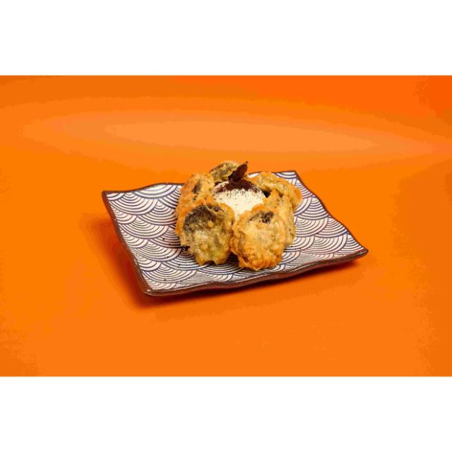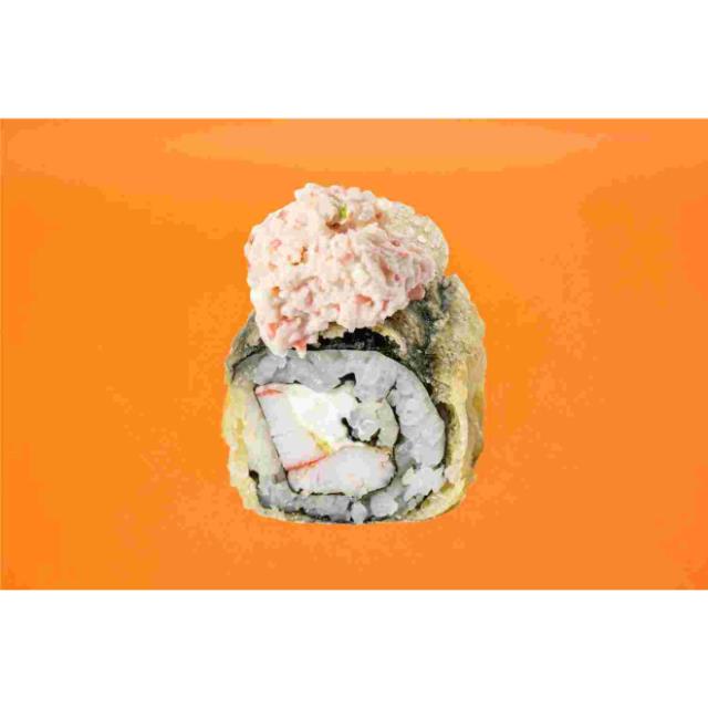 Camarón empanizado, tampico, queso crema, aguacate ( ) Tártara, furikake