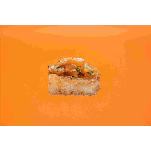 Arroz crujiente, salmón, yuzu, cilantro, cebollín