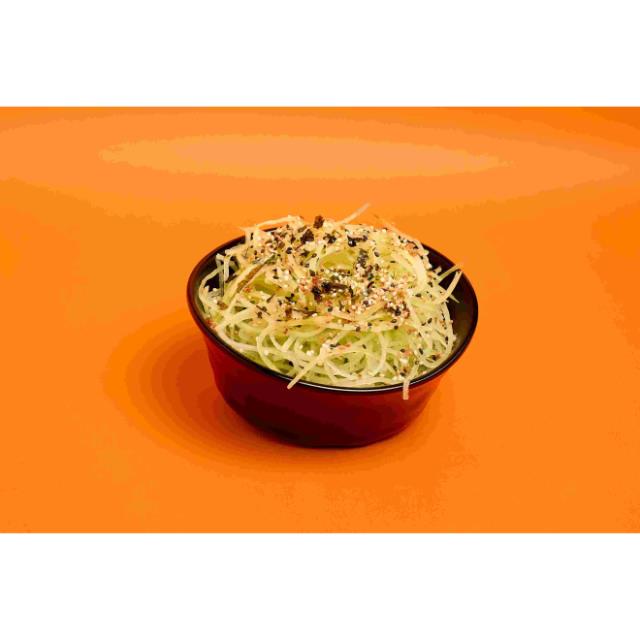 Pepino finamente cortado marinado en vinagre con furikake y ajonjolí.