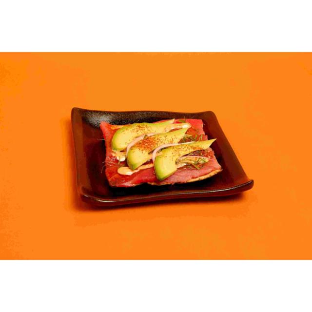 (1) Tostada de maíz, atún, aguacate, cebolla morada, cilantro, sal diablito y aderezo mongolian
