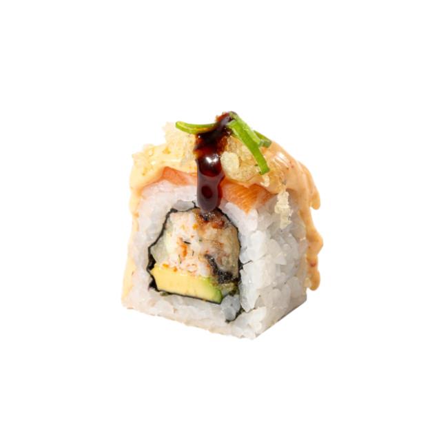 Salmón ahumado, camarón, surimi, aguacate y anguila. Salsa de anguila y ajonjolí anguila. Salsa de anguila y ajonjolí.