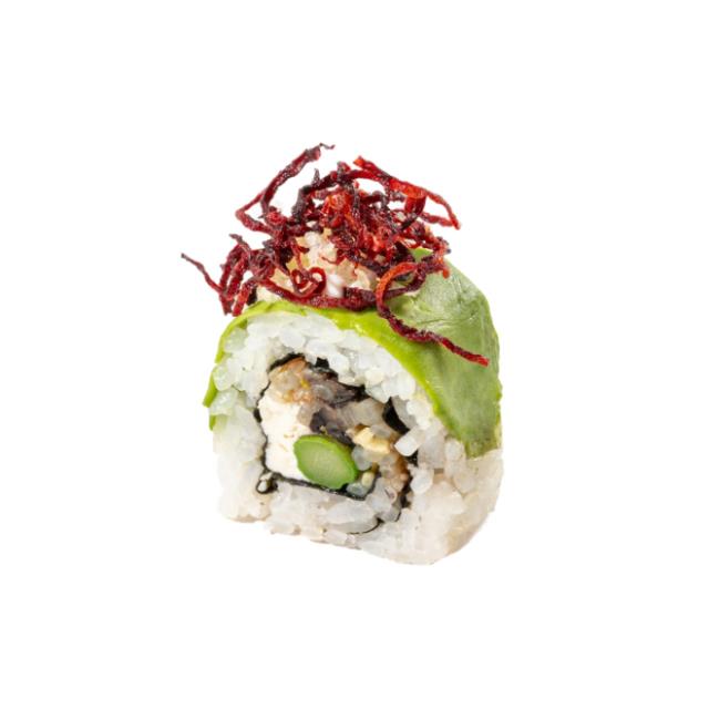 Germen de soya, champiñón, espárrago y tofu. - Aguacate, tempura flakes, kakiage de betabel, mayo-vegan y honey sriracha.