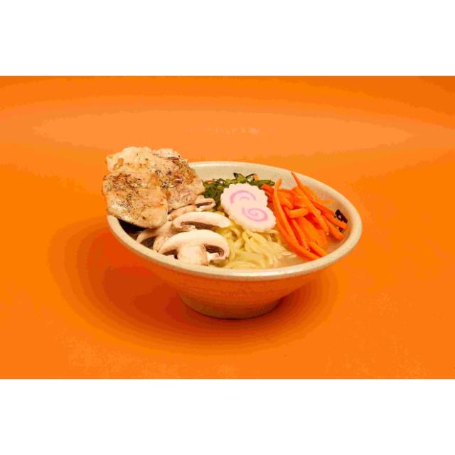 Pasta de ramen con cebollín, champiñones, zanahoria, naruto y pollo