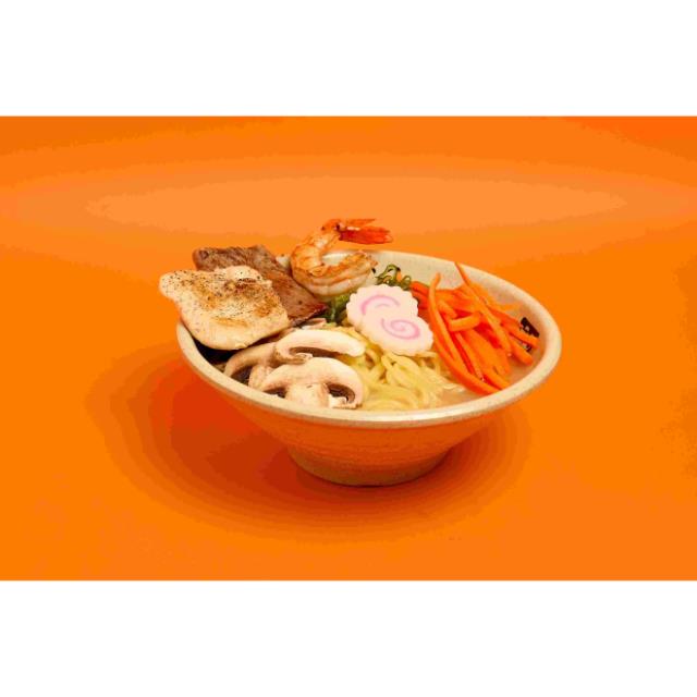 Pasta de ramen con cebollín, champiñones, zanahoria, naruto, pollo, camaron y carne