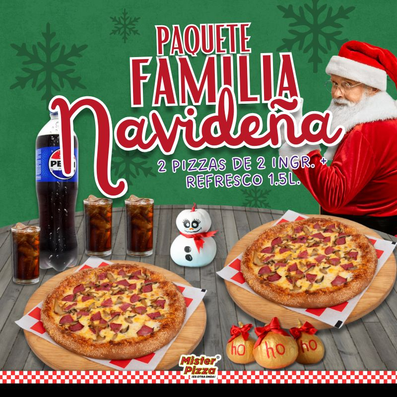 Todo el sabor de Mister Pizza en un solo paquete; Pizza grande de pepperoni con queso 100% leche y ajonjolí en las orillas, ½ L de espagueti con queso, orden de papas criss cut horneadas y refresco de la familia Pepsi de 1.5L.