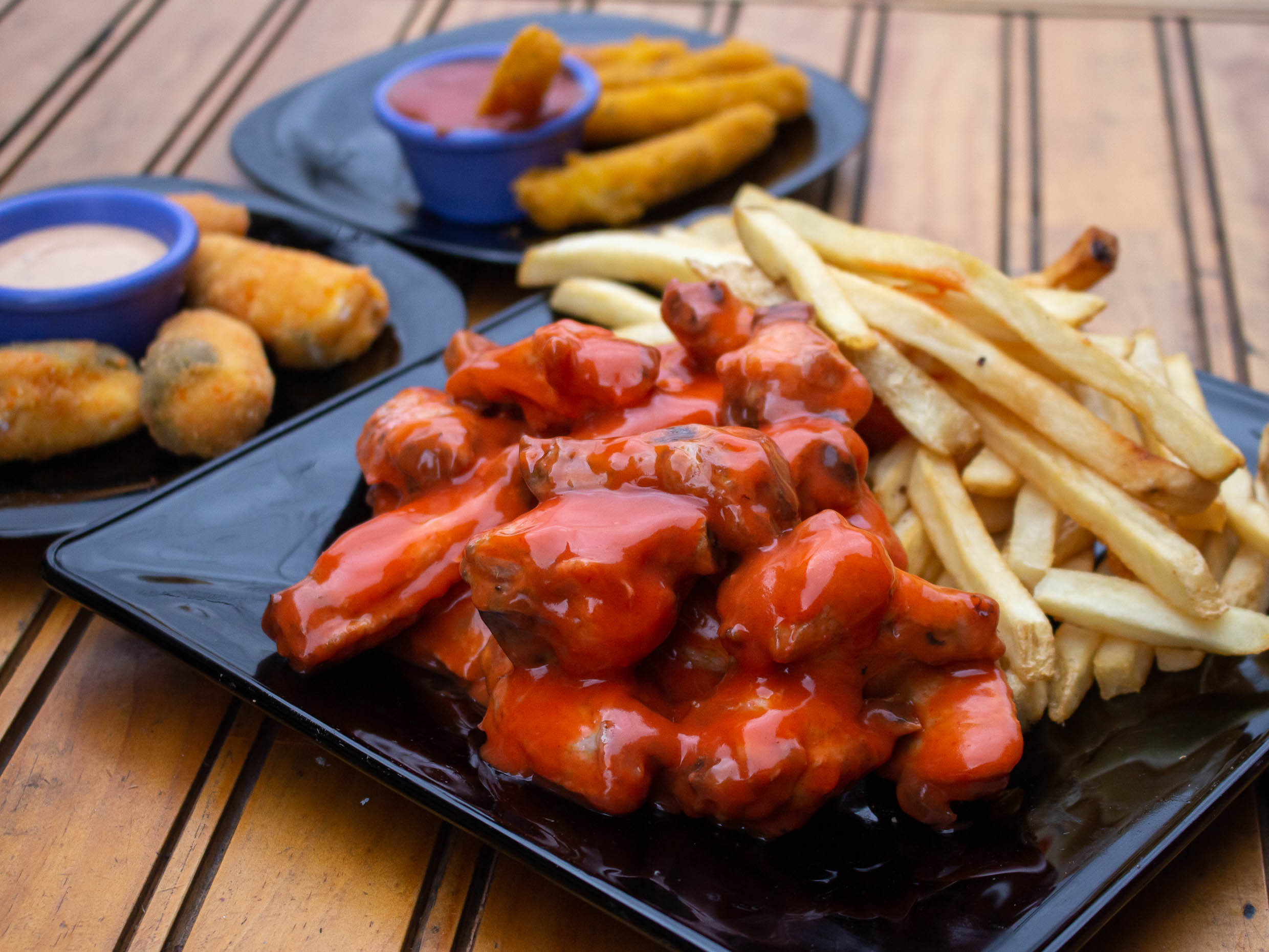 250 Gramos de alitas, 250 grs de strippers cocinados al momento, bañados en la salsa de tu preferencia, 200 grs de papa francesa y 5 dedos de queso. Todos acompañados con aderezo gourmet de tu preferencia (Blue cheese o anch chipotle).