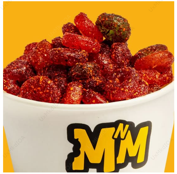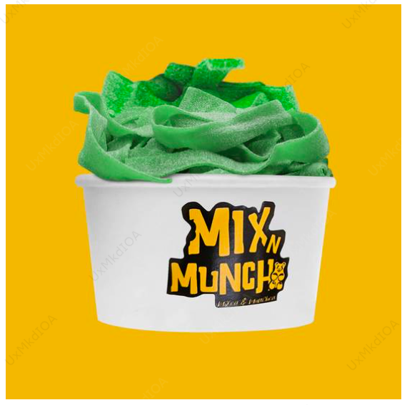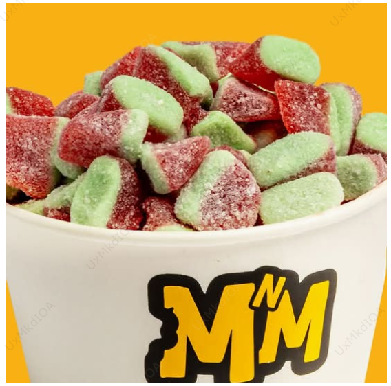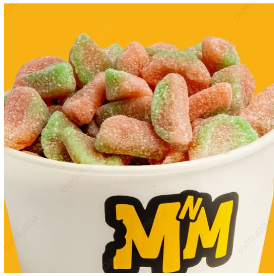 Vaso mini munch 6 oz lleno con riquísimas gomitas mini sandías cubiertas con nuestra receta gourmet de chamoy y selección de chiles en polvo.