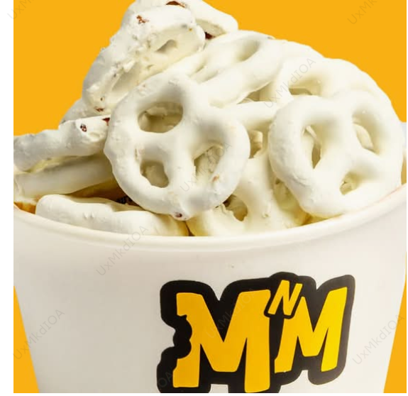 Vaso mini munch 6 oz lleno con riquísimos pretzels cubiertos de chocolate blanco y yogurt.