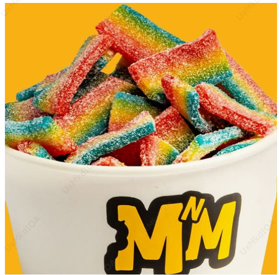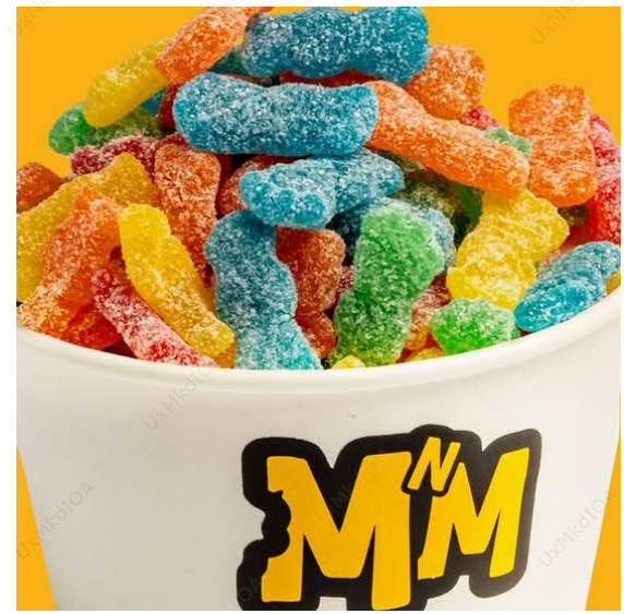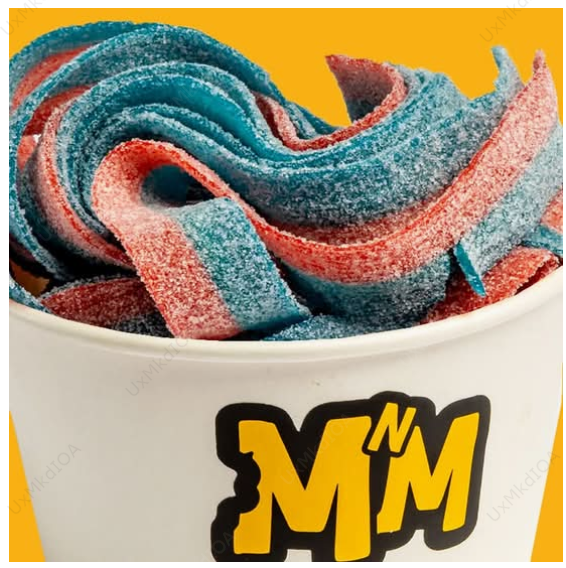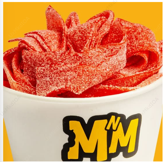 Vaso mini munch 6 oz lleno con riquísimas sour strawberry bands.