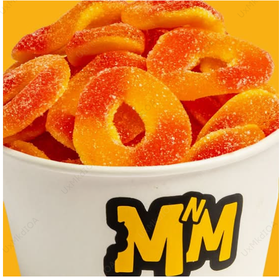 Vaso mini munch 6 oz lleno con riquísimas gomitas de aros de durazno.