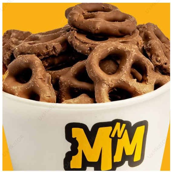 Vaso mini munch 6 oz lleno con riquísimos pretzels cubiertos de cocoa.