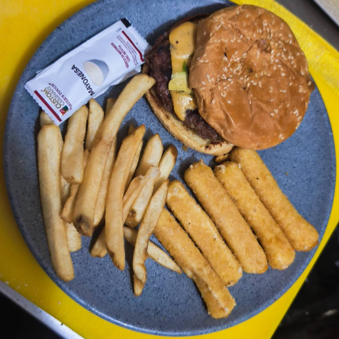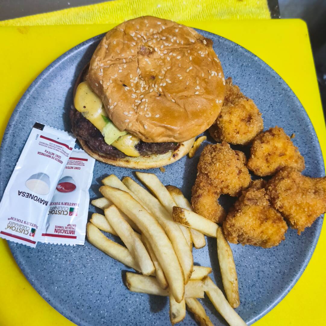Hamburguesa,boneles ,papas ,aderezos ,jalapeño.