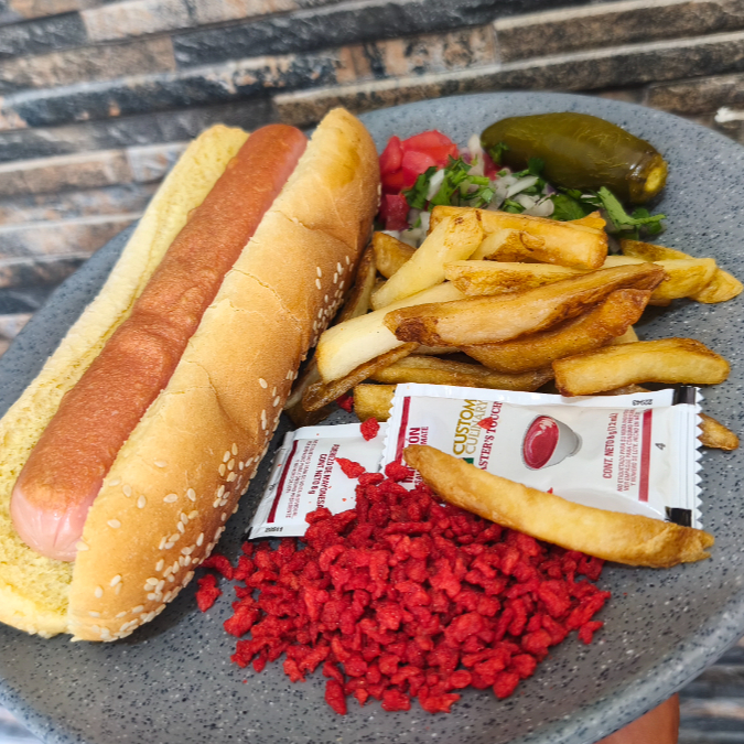 Carne de res, jalapeño relleno de Filadelfia, jamón, queso, aderezos, papas y jalapeños.