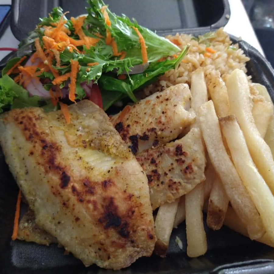 200 gramos de filete pescado empanizado, arroz, papas ,ensalada, aderezos y salsa.