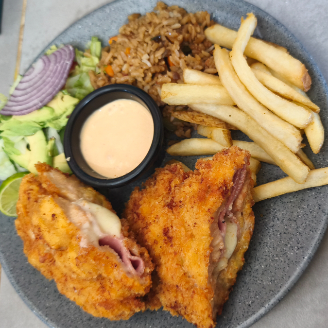 250 gramos de pollo rellena ,jamón ,queso ,arroz, papas, ensalada, aderezos y salsa.