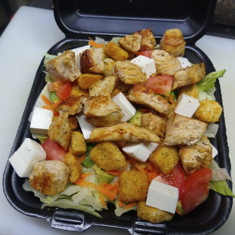 200 gramos de pollo ala plancha, Tomate, Aguacate, panela, Zanahoria, crotones, lechuga y aderezo ranch.