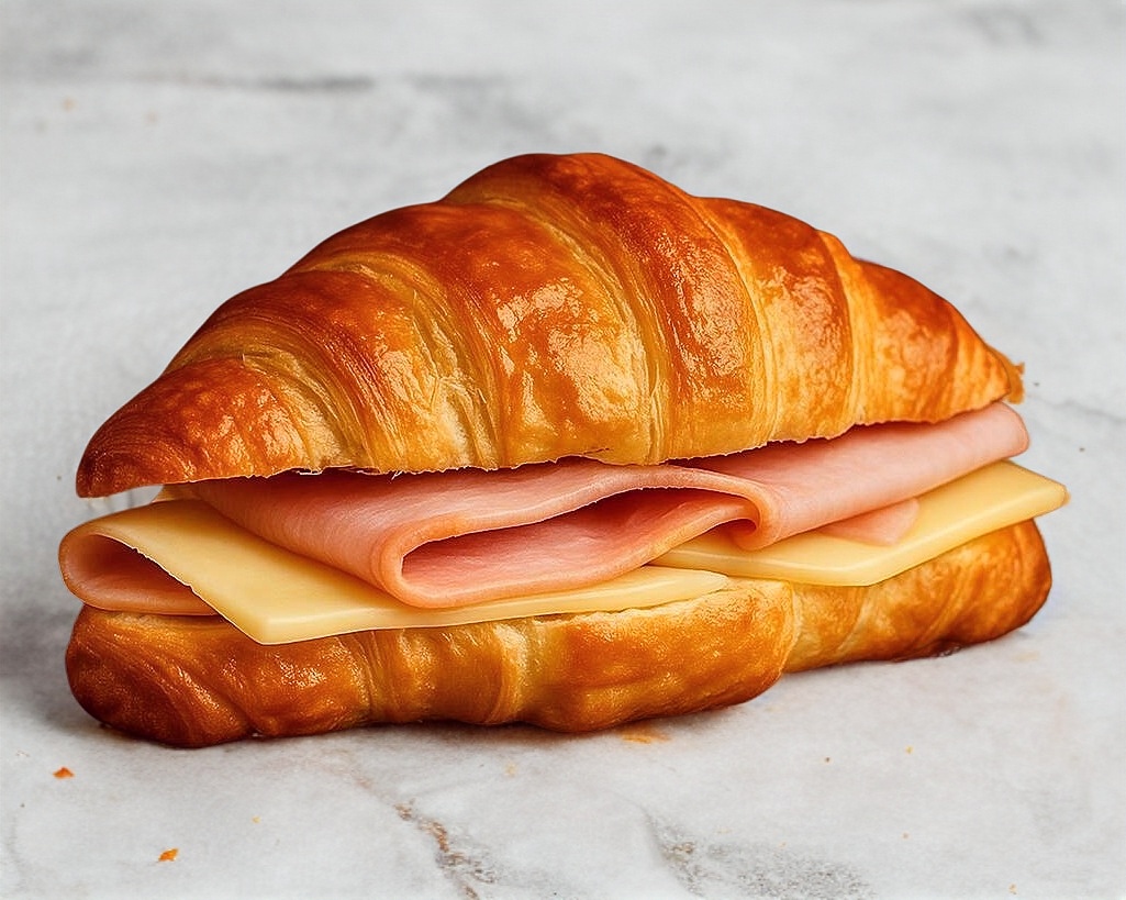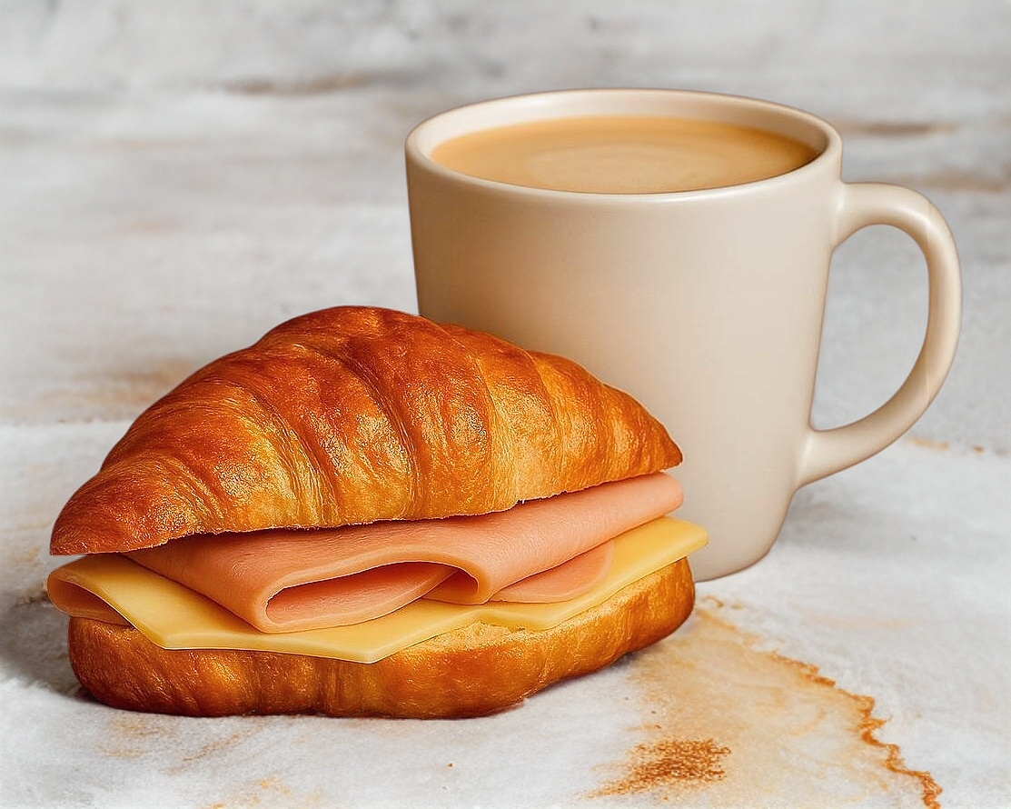 Latte caliente de 12 oz + cuernito de jamón y queso