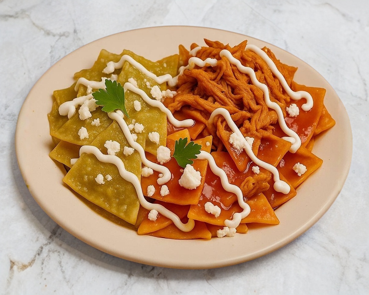 Chilaquiles con pollo, queso y crema en salsa roja y/o verde