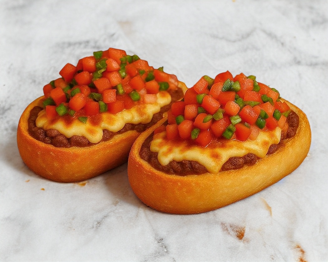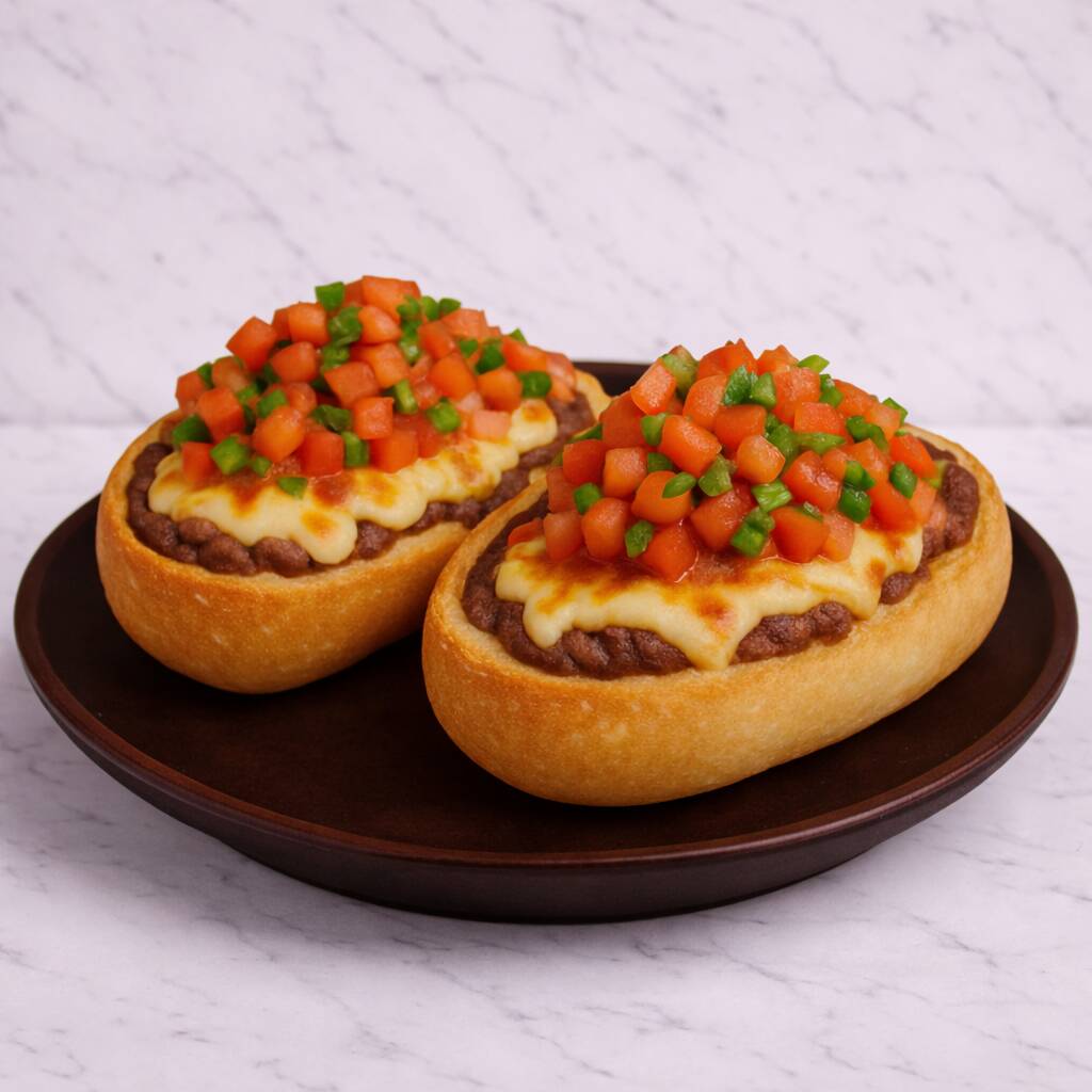 Pan francés cubierto de frijoles molidos y queso gratinado acompañado de salsa de pico de gallo