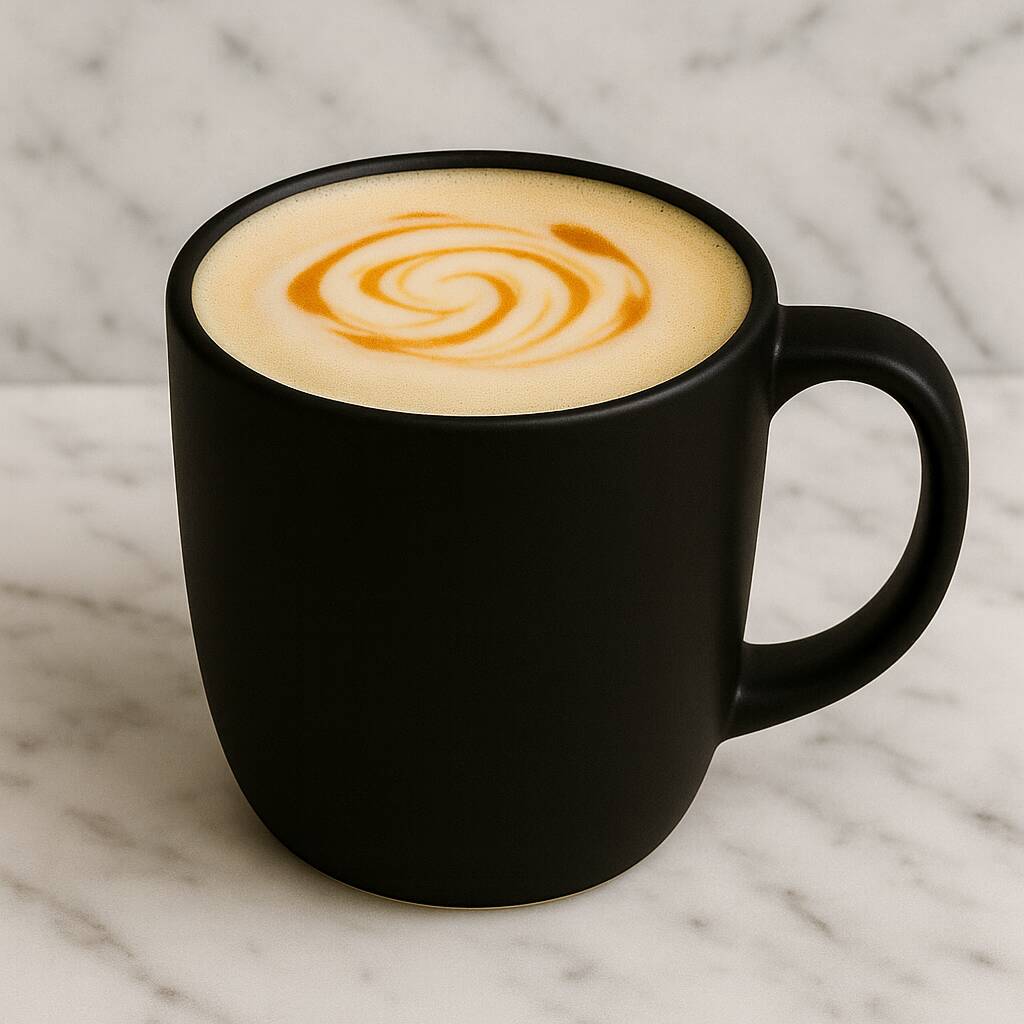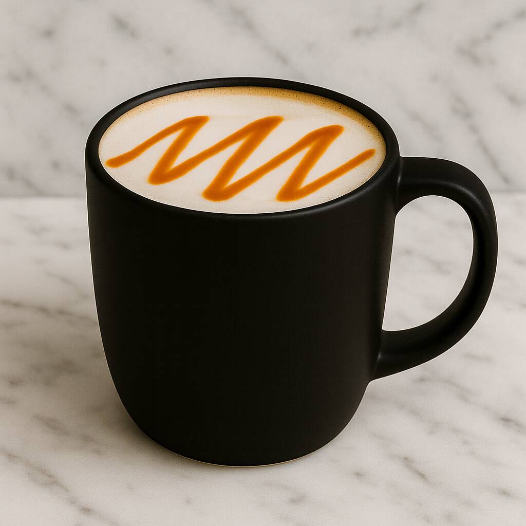 12 oz de café con leche caliente, salsa de cajeta y una ligera capa de espuma