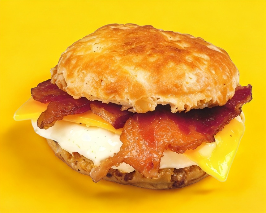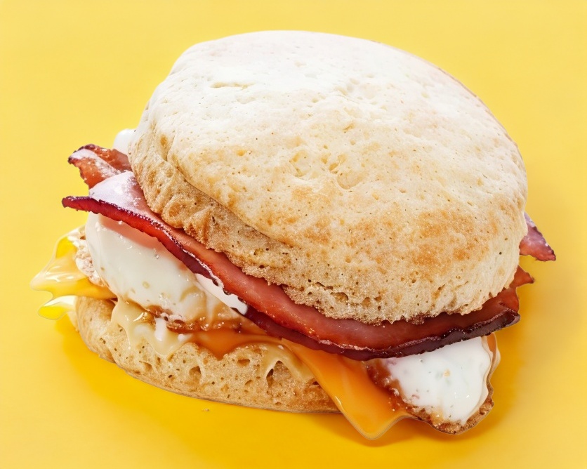 Biscuit relleno de una tarta de huevo, tocino ahumado y queso amarillo.
