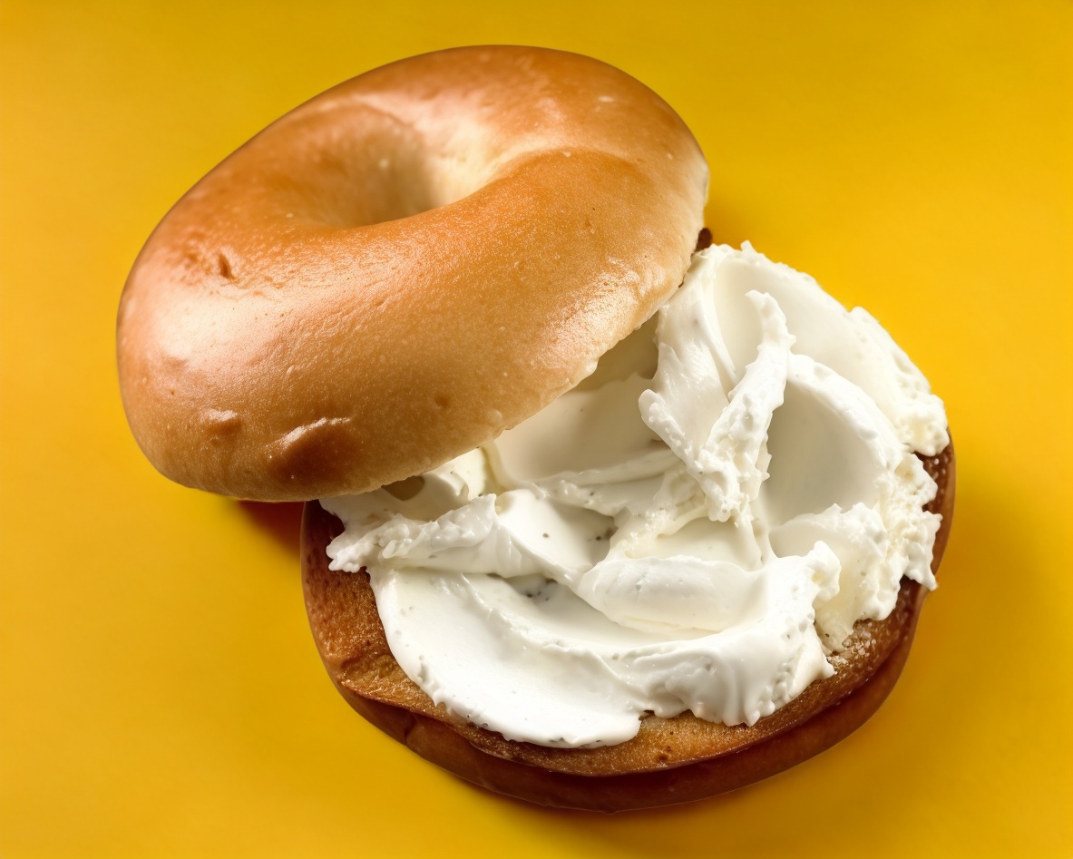 Bagel realizado con pan artesanal, tradicionalmente elaborado con harina de trigo y que suele tener un agujero en el centro, acompañado de queso crema y mermelada de fresa.