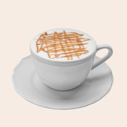 Leche al vapor manchada con espresso y un toque de vainilla, cubierta con un característico dibujo de caramelo.