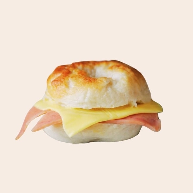 Pan de biscuit relleno de una tarta de huevo, jamón de pavo y queso amarillo.