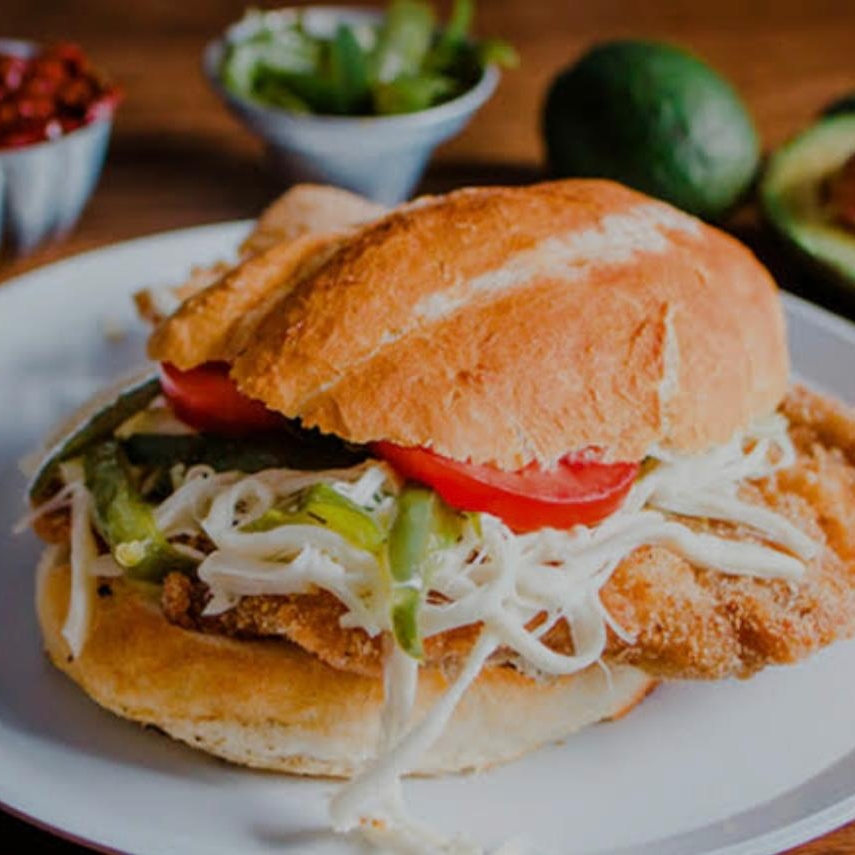 Milanesa de pollo, queso amarillo, quesillo,(frijoles, mayonesa, cebolla, tomate, aguacate)