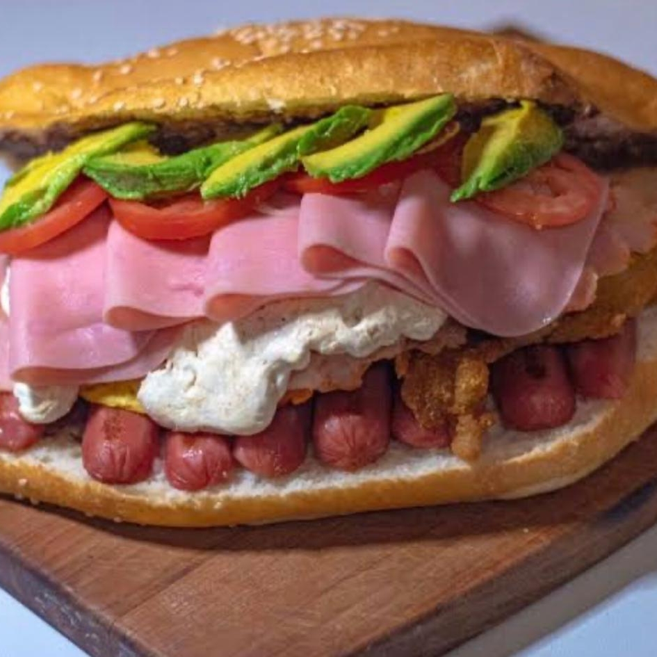 Milanesa, jamón, quesillo ( frijoles, mayonesa, cebolla, tomate y aguacate)