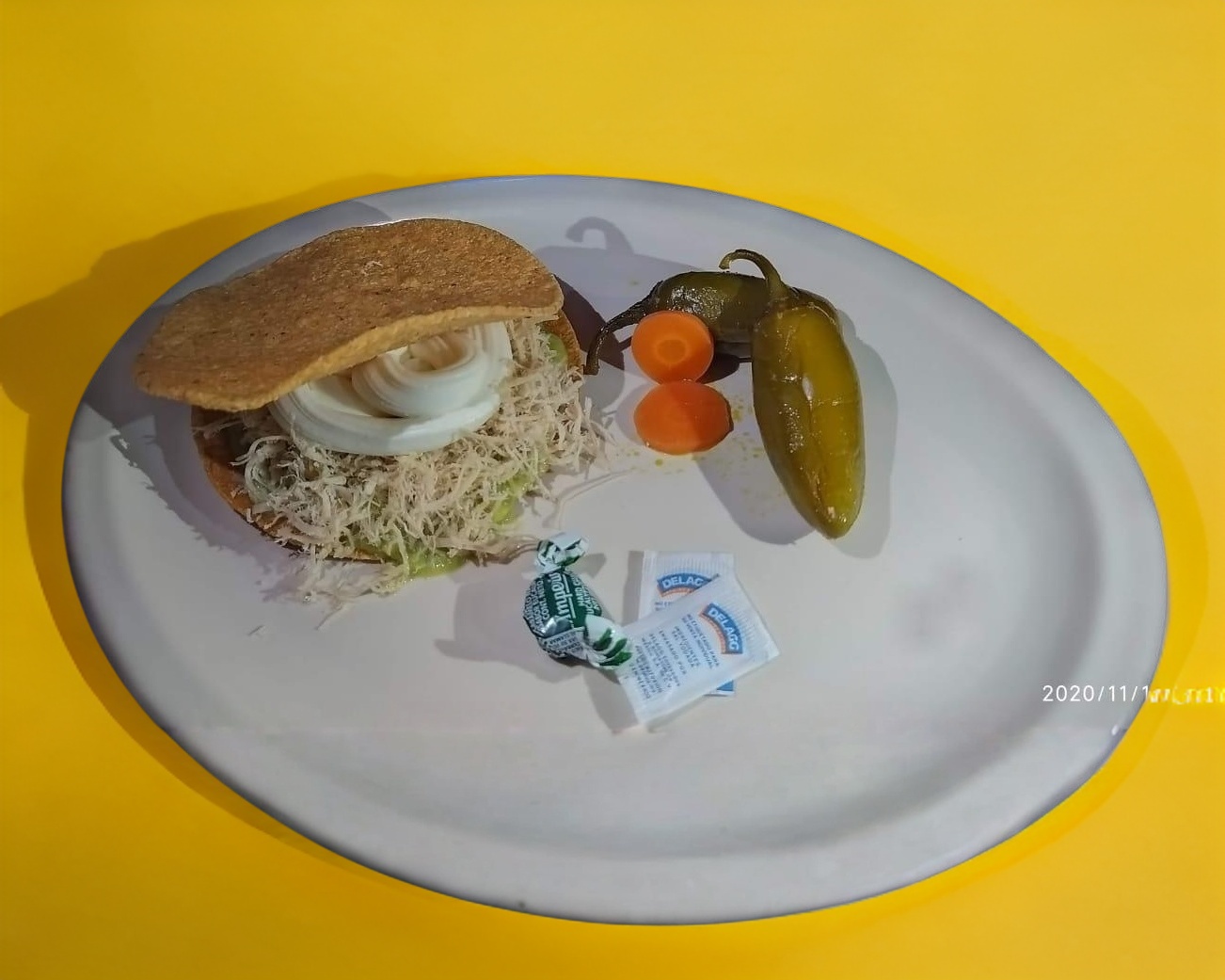 Tostada especial con doble porción de crema pollo y guacamole