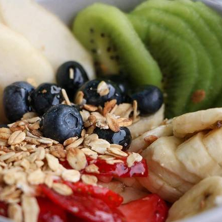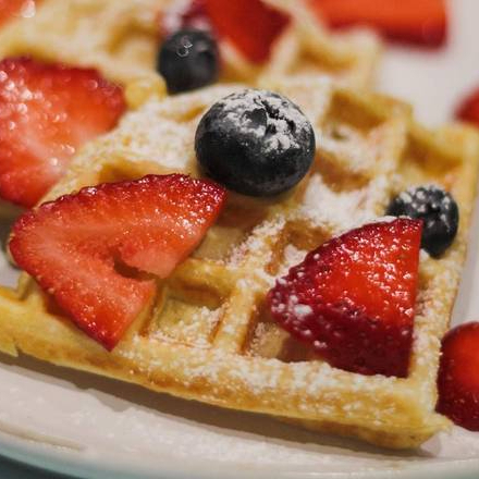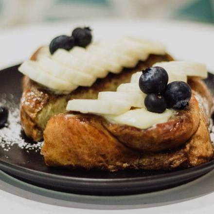 Base de pan brioche, mantequilla de vainilla, plátano, moras y maple.