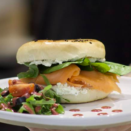 Pan bagel, salmón ahumado, aderezo de queso de cabra con queso crema, espinaca, alcaparras, aceitunas negras, tomate cherry, con mini ensalada de arugula con vinagreta de frutos rojos.