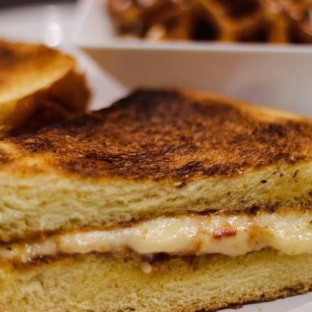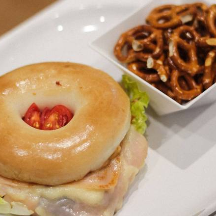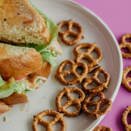 Pan brioche, aderezo de chipotle, mix de 3 quesos, acompañado de pretzels.