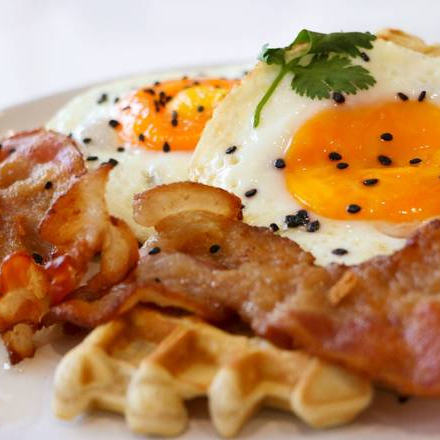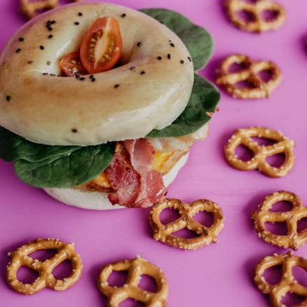 Pan bagel, aderezo chipotle, espinaca, tocino, huevo revuelto.