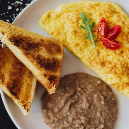 Elige la preparación e ingredientes de tus huevos. Incluye frijoles y pan.