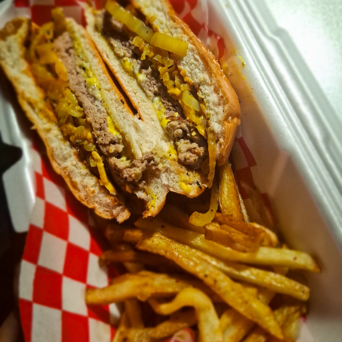 Hamburguesa de Carne de Res con Queso y Cebolla En Mostaza