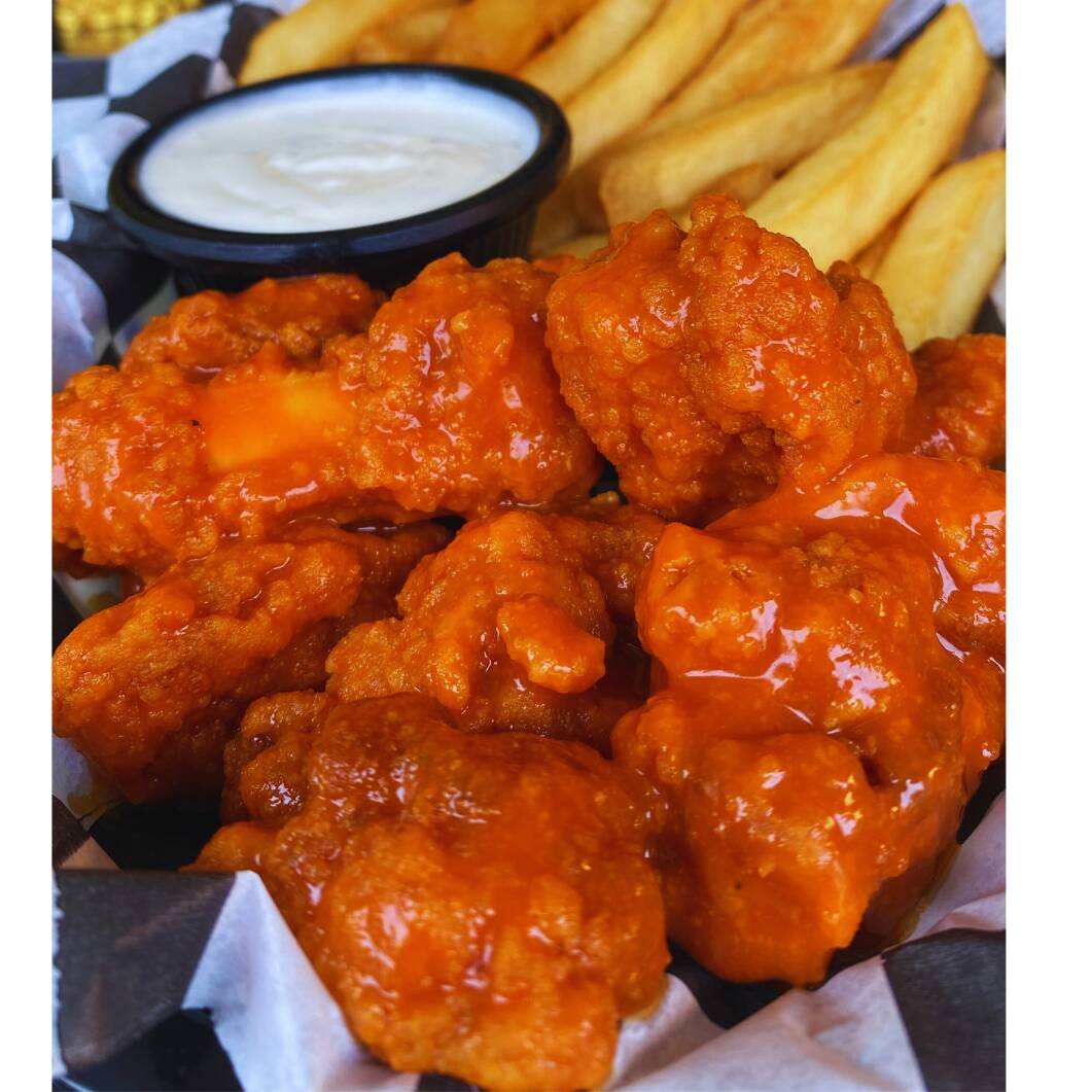 Orden papas fritas acompañada de mini boneless bañados en búfalo, ranch y queso cheddar.