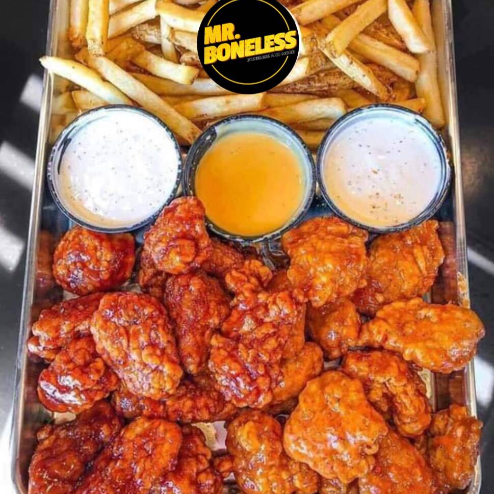 12 a 15 Piezas de boneless crujientes bañados en tu salsa favorita acompañados con aderezo ranch y papas fritas.