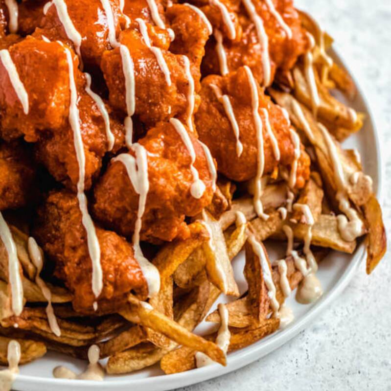 Cama de papas a la francesa con boneless encima bañados en salsa búfalo, queso cheddar y aderezo ranch.