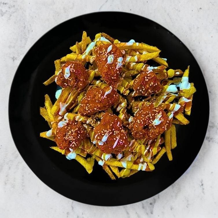 300 gr de papa frita, 200 gr de boneless, queso derretido,catsup, aderezo especial y ranch