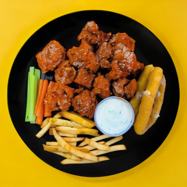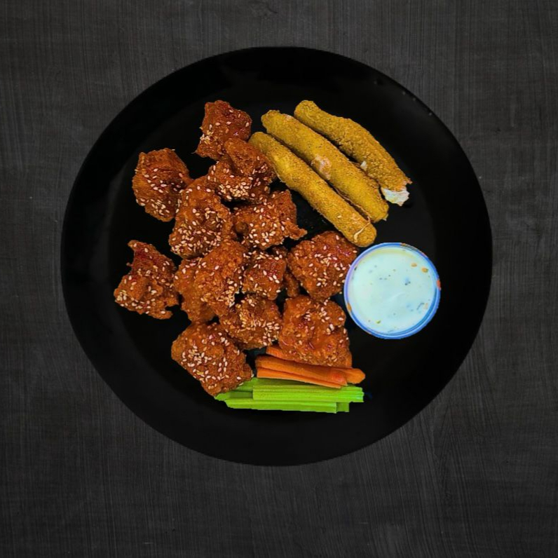 15 Piezas de boneless, báñalos con tu salsa favorita, aderezo ranch 3 dedos de queso mozzarella.
